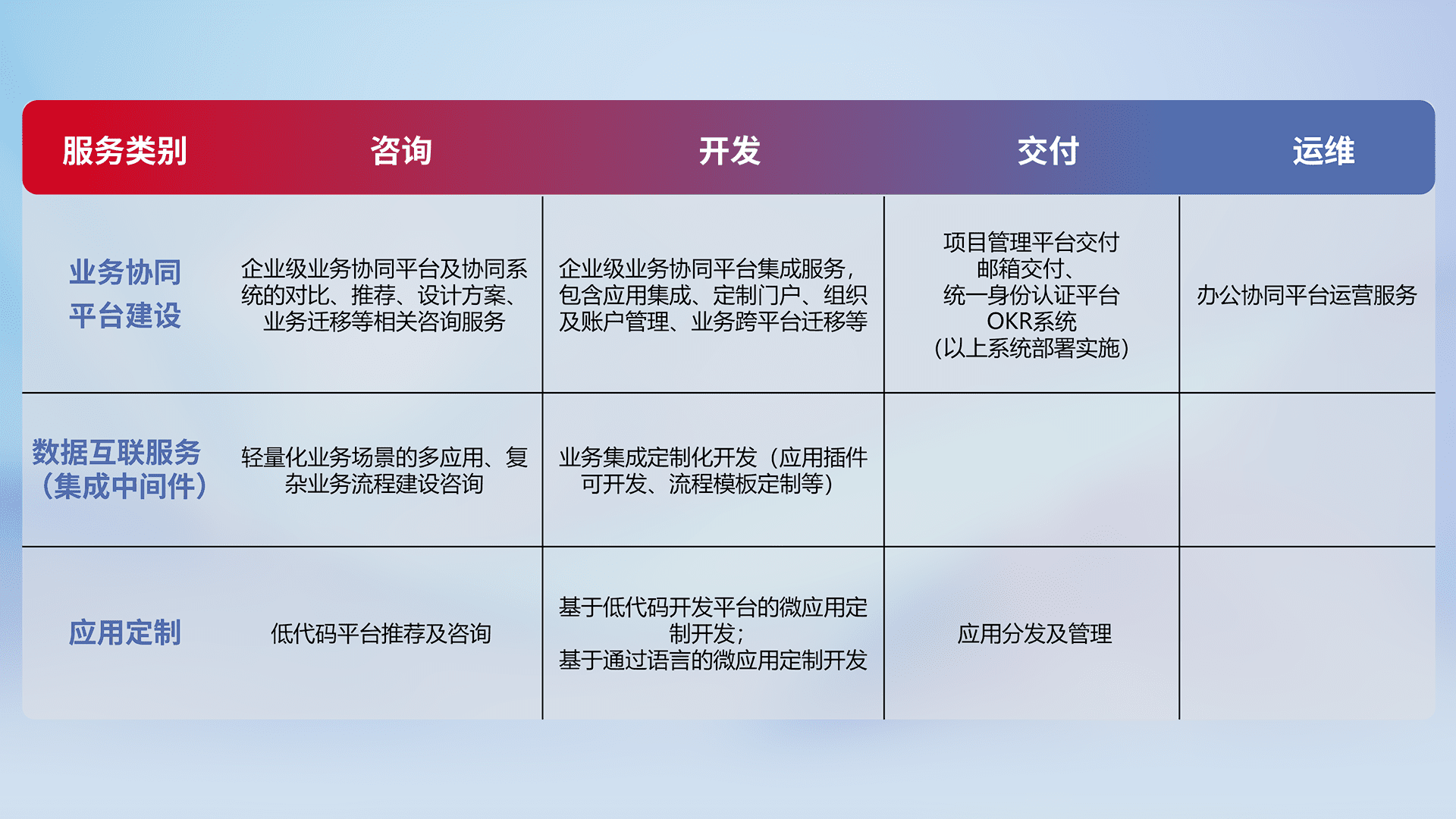 针对钉钉、、、、企微、、IDaas等平台级产品提供产品的规划、、方案、、、、交付、、、定制化开发等服务,,,实现如统一协同办公、、、、智能客户服务、、、混合会议管理、、、智能数据查询、、、、等业务场景,,,实现数字化转型。。。